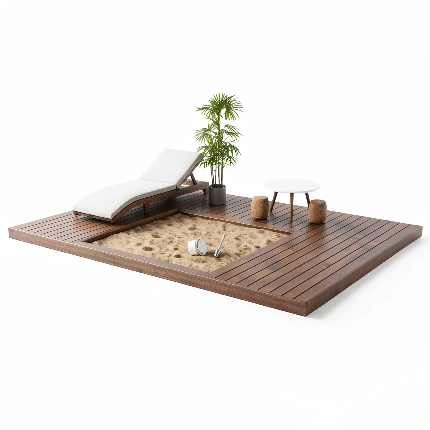 Terassi hiekkalaatikolla kootaan yhdestä 1x2 m terassin kävelytie-elementista, kahdesta 1x3 m terassielementista ja hiekkalaatikon runkosta, joiden 45x95 mm kestopuinen pohjarunko toimii kantavana rakenteena.
