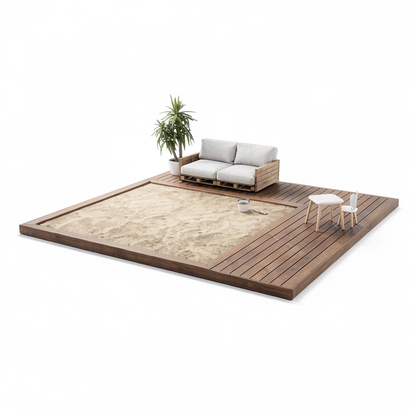 Terassi hiekkalaatikolla kootaan yhdestä 1x3 m terassin kävelytie-elementista, yhdestä 1x4 m terassielementista ja hiekkalaatikon runkosta, joiden 45x95 mm kestopuinen pohjarunko toimii kantavana rakenteena.