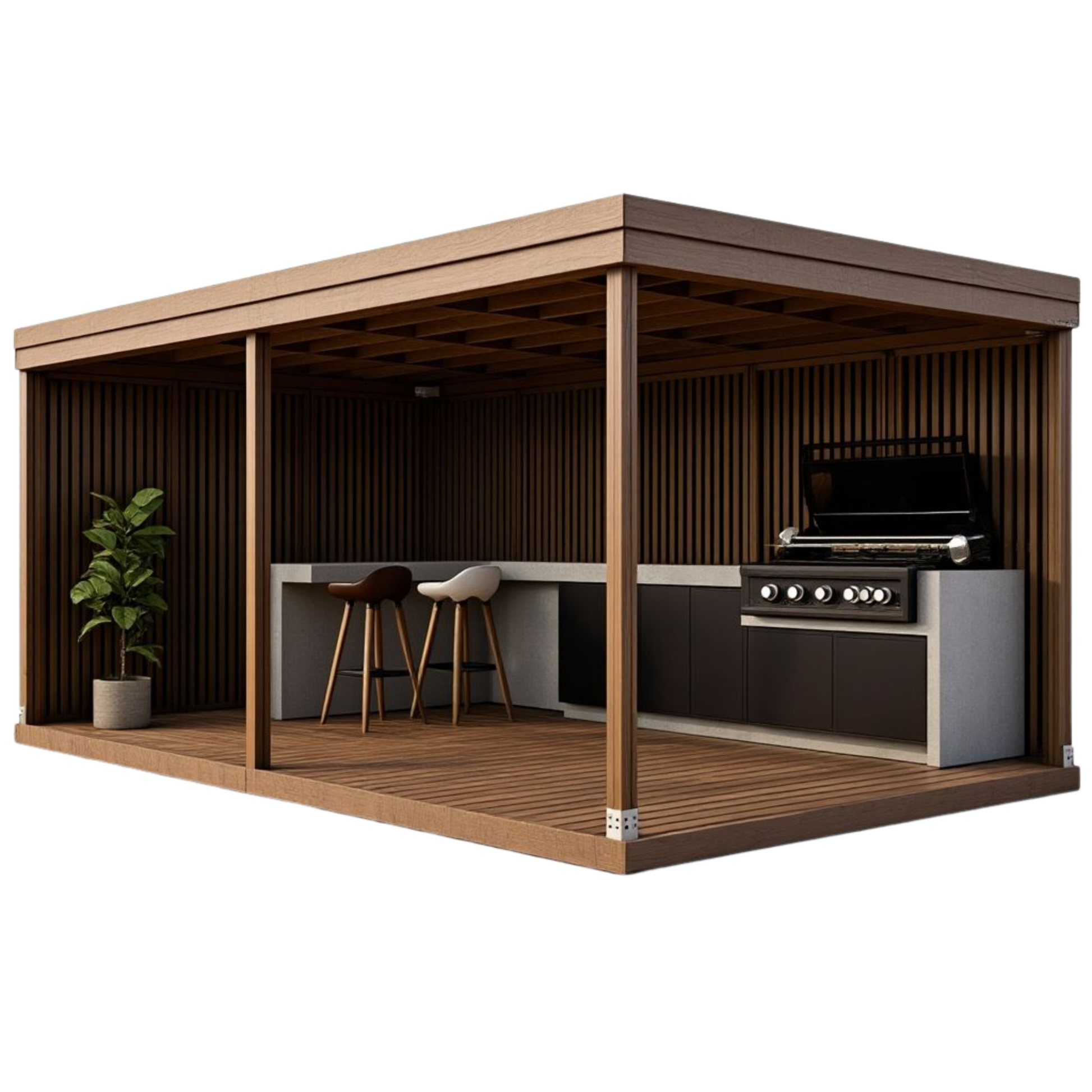 Toimitus sisältää terassielementit, seinäelementit, kattoelementit, kattopalkit, tolpat, päätylaudat ja kiinnikkeet. Ostoskoriin on mahdollista lisätä säädettävät terassijalat.