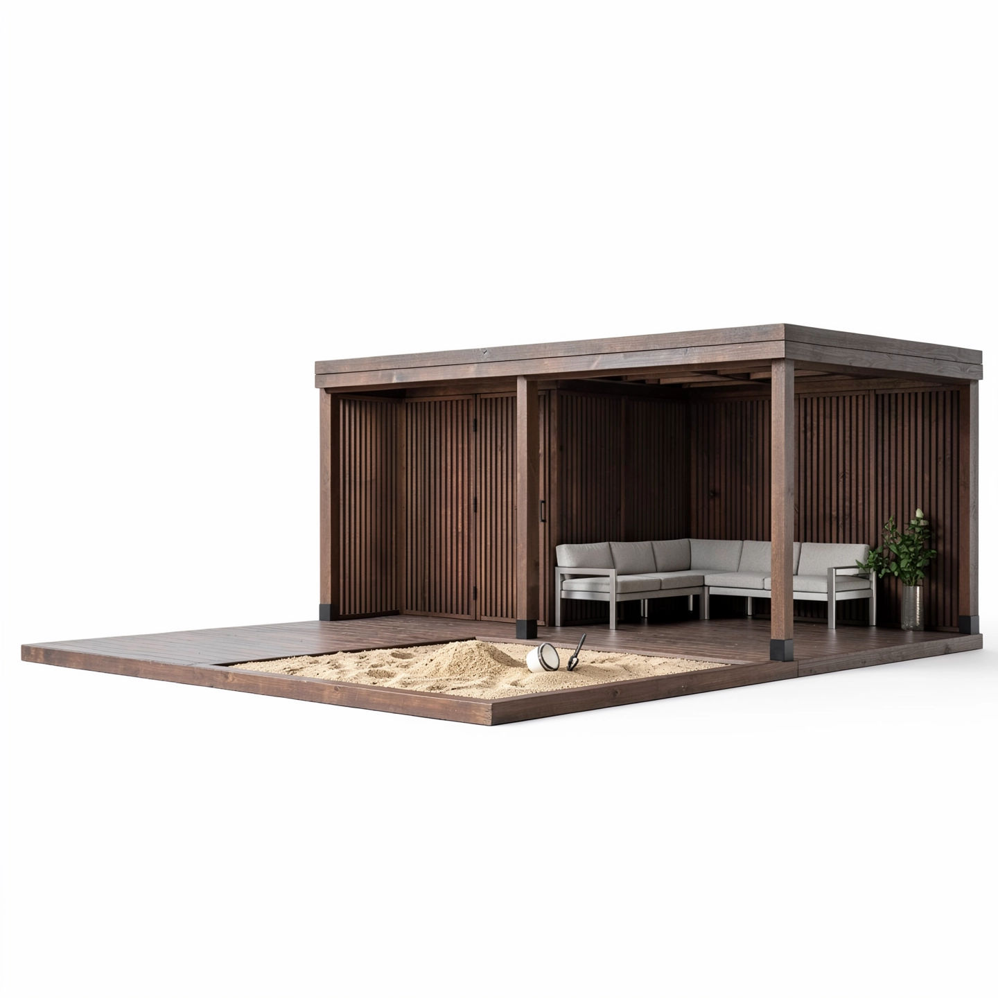 Toimitus sisältää terassielementit, seinäelementit, kattoelementit, kattopalkit, tolpat, hiekkalaatikon runkon, päätylaudat ja kiinnikkeet.